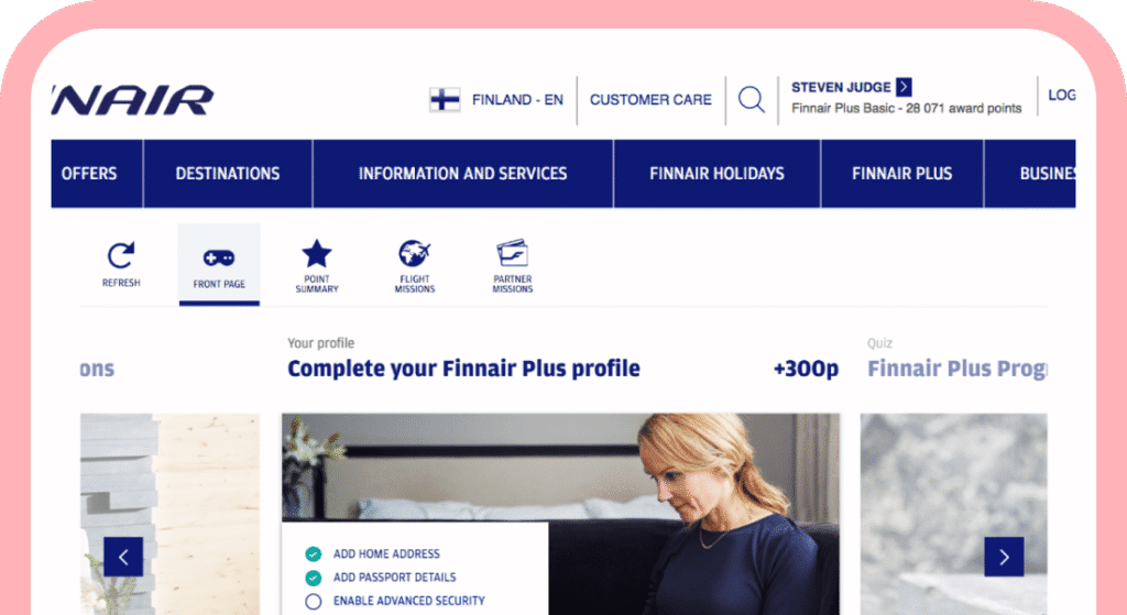 GameLayer extends the Finnair frequent flyer programme rewarding members with bonus points for completing personalised, non-transactional tasks that bring value to the airline—like giving marketing permissions or updating traveler profiles. These bonus points unlock travel perks, taking members on an aspirational journey through the programme’s tiers.