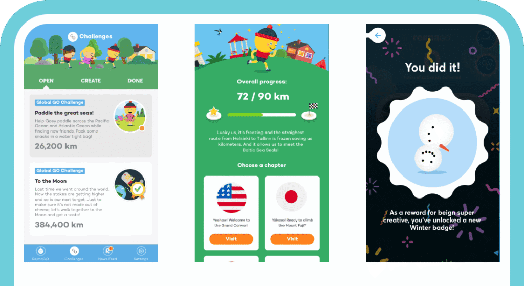 GameLayer brings the Reima app to life with a learning adventure powered by collaborative physical activity. The experience centres on a character on a journey around the world, where kids choose the next destination and learn fun facts about it. To reach the destination and unlock achievements, kids have to get active while wearing an activity tracker, helping the character travel on his journey.